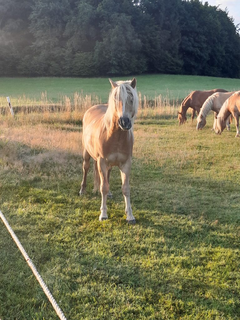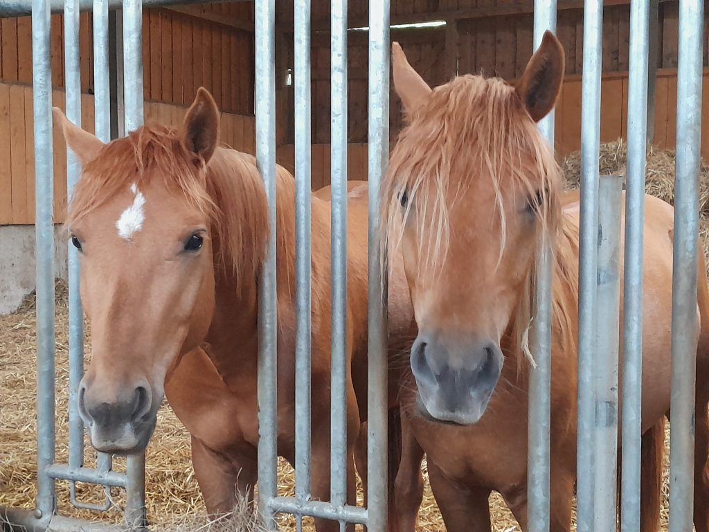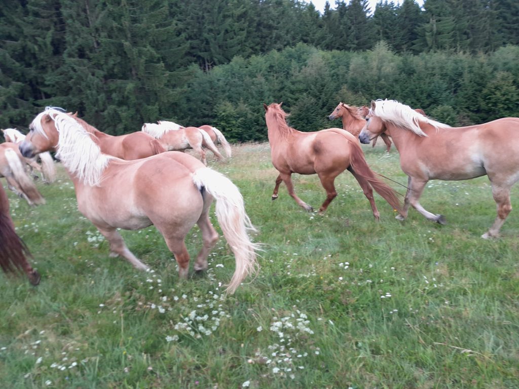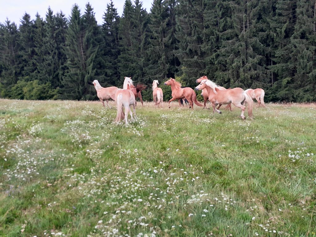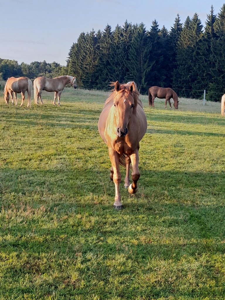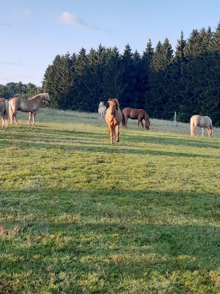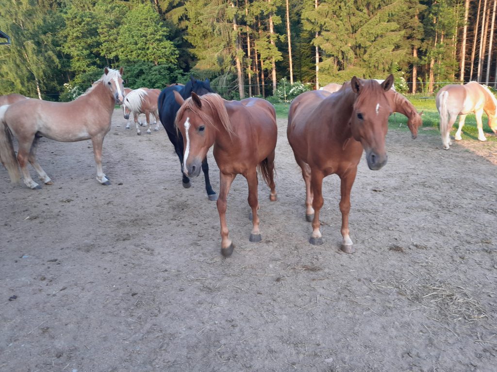Auf ca. 8ha Weide und einem großen, hellen und luftigen Laufstall mit ca. 400qm wachsen unsere Jungpferde in einer Herde auf.
